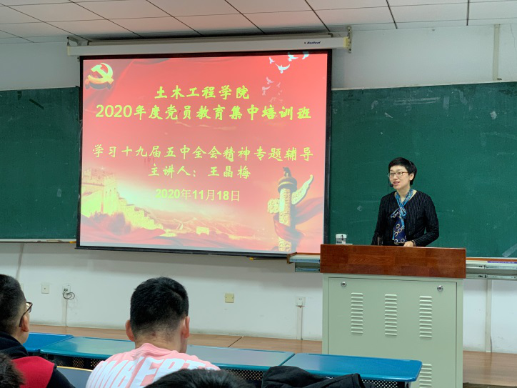 2020年11月18日,支部书记王晶梅同志为土木工程学院2020年度党员教育集中培训班作题为《擘画新蓝图 开启新征程——党的十九届五中全会精神解读》的学习党的十九届五中全会精神专题辅导。王晶梅此前已入选大连青年讲师团,目前正参与由大连团市委、大连新闻传媒集团联合举办的主题《思政公开课》全媒体宣教活动。