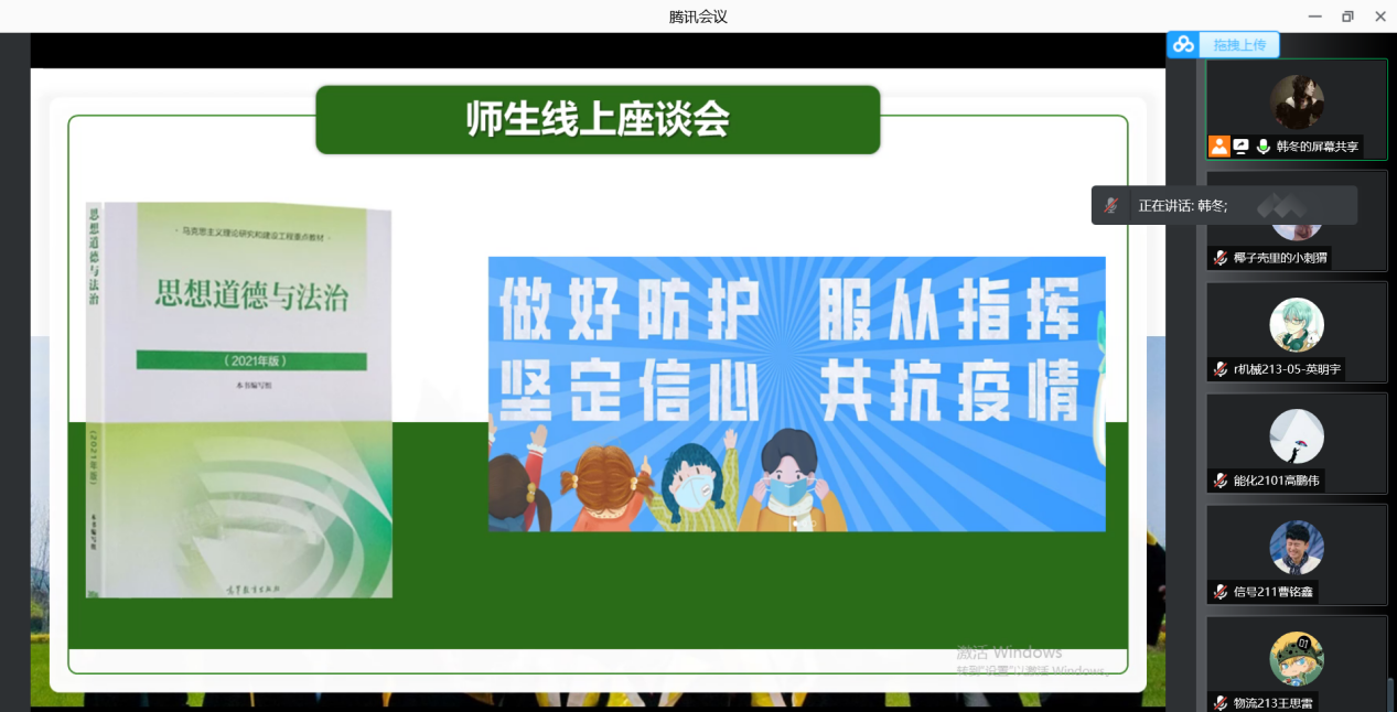 11月21日晚间,思想道德修养与法律基础教研室召开本学期“思想道德与法治”课师生座谈会。座谈会采用腾讯会议方式,邀请了2021级100多位本科生代表参会。