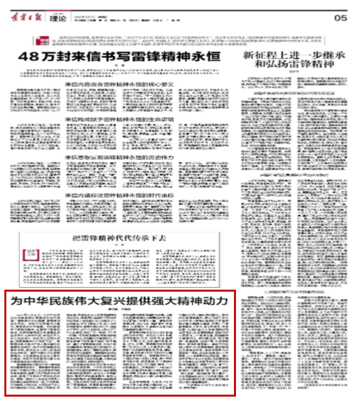教师曹淑豪与合作者共同撰写的理论文章《为中华民族伟大复兴提供强大精神动力》。文章强调指出,雷锋精神是中国共产党人精神谱系的重要组成部分,是中华民族精神的最好写照,是社会主义核心价值观的生动体现。新时代仍然要大力弘扬雷锋精神,不断增强“四个意识”,坚定“四个自信”,坚决做到“两个维护”,为全面建设社会主义现代化国家、实现中华民族伟大复兴提供强大精神动力和丰厚道德滋养。
